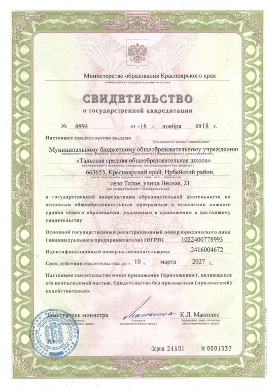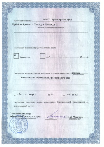 Адрес местонахождения образовательной организации* 663653, Красноярский край, Ирбейский район, село Талое, Лесная улица, 21